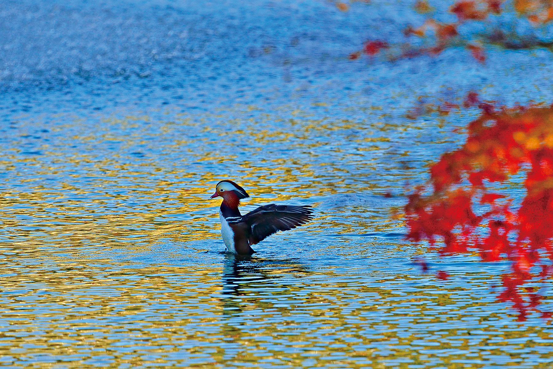 「紅葉」と書いて「モミジ」とも読みますが、それだけモミジが日本の秋を象徴する存在だということではないでしょうか。最初の写真は、オシドリが真っ赤に紅葉したモミジの下で翼を広げているところです。池の縁から枝が低く水面上に張り出していたこと、また、私が少し高い位置から撮影していたことで、オシドリとモミジを同じ画面に収めることができました。