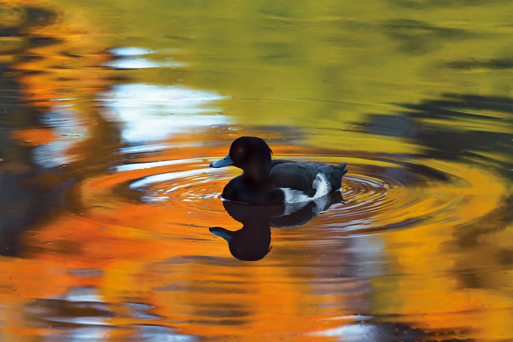 下の写真(web上では下の写真)は早朝のキンクロハジロです。露出を調整してアンダー気味に撮っています。これから本格的に明るくなる時間帯で、太陽が横から水面を照らしていました。水面は池の辺に生える木々の赤や緑、黄色の葉を映しており、鳥が少しだけ移動してもその周りの色が変わるので、いくつもの魅力的なシャッターチャンスに恵まれました。同心円状の波紋は、キンクロハジロの動きによって作られたものです。