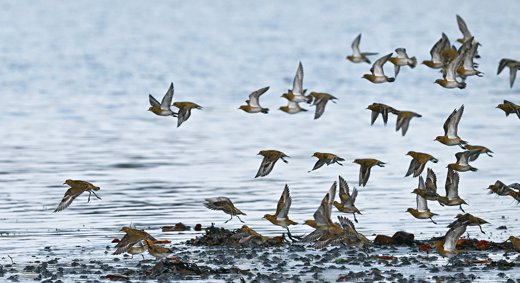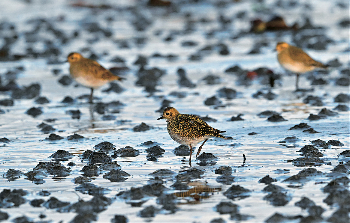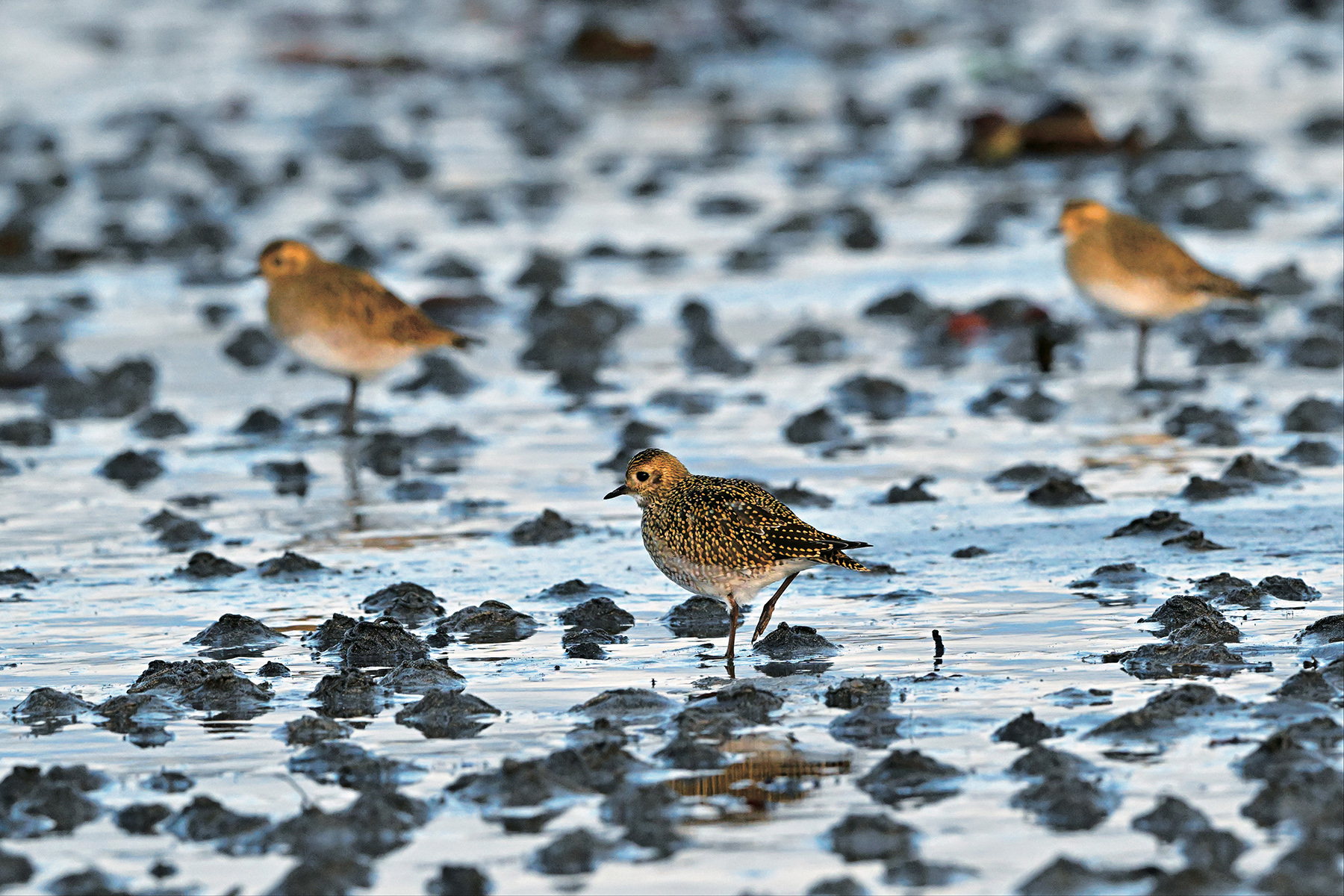 最初の鳥はヨーロッパムナグロです。英名はGolden Plover。このように光があたるとまさにその名の通り、金色が美しいですね。春と秋の渡りの季節に日本を通過していくムナグロとよく似ています。