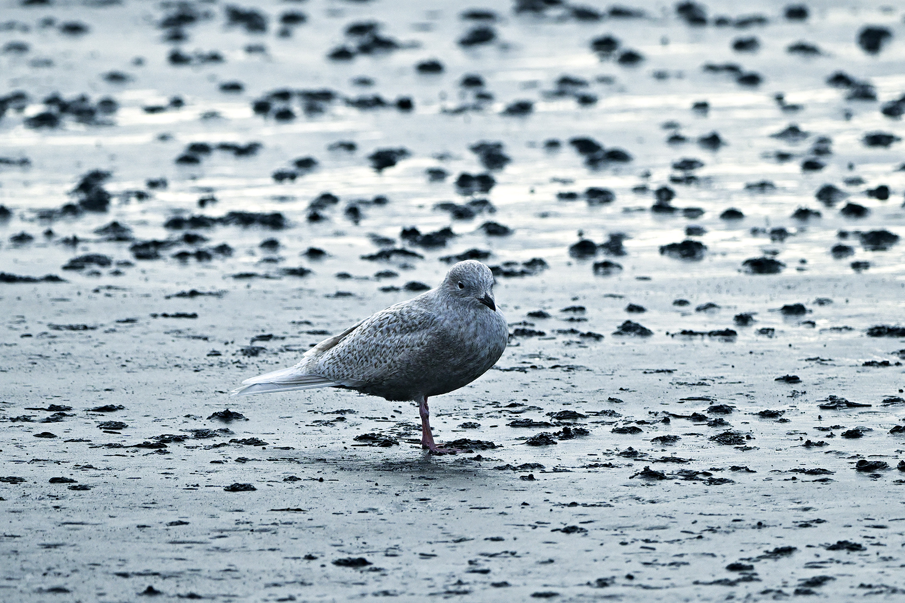 このページの写真(web上では下の写真)はアイスランドカモメの若鳥で、ほかのカモメの若鳥と比べると、より淡いグレーで、やさしい雰囲気のカモメです。この若鳥を見つける前に、成鳥も見ることができました。ヨーロッパムナグロが飛び立った時、その向こうにほかのカモメ数羽と一緒に目をつぶって休んでいました。成鳥は全体的にとても薄いグレーで、セグロカモメなどに比べるとひと回り以上、小さい印象を受けました。