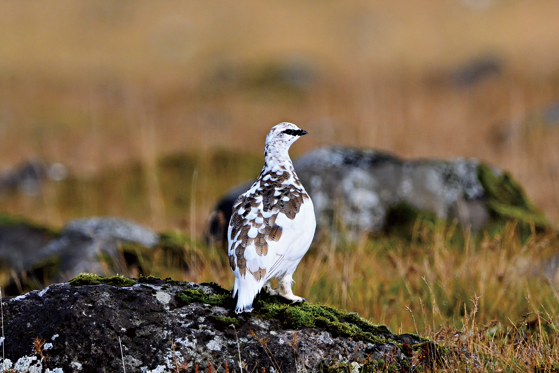 最後の2枚はライチョウです。上(web上では下1枚目の写真)のライチョウは真っ白に換羽していました。まだ雪は降っていませんでしたが、帰国後1週間ほどで初雪であったと聞きました。下の写真(web上では下2枚目の写真)のライチョウはまだ換羽の途中で茶と白の斑模様。10月半ばですので、日本のライチョウより1カ月半ほど早い換羽です。アイスランドほか北極周辺に生息するライチョウの換羽は「冬羽」と「繁殖羽」の年2回です。それに対し、世界の最南端に生息する日本のライチョウは、雪のない期間が長いため、秋羽の換羽を進化させ、年に3回換羽します。