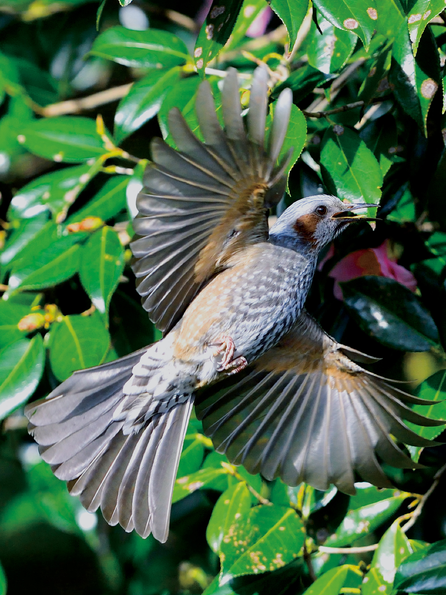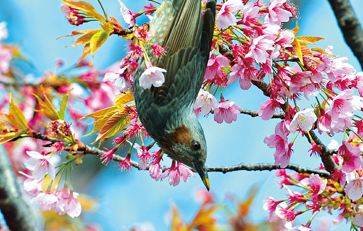 また、市街地への進出を支えていたのが、餌となるさまざまな食物です。ヒヨドリはもともと雑食なので、写真でご覧いただいている椿や桜のほか、梅やあんずなどの花の蜜、柳の花芽や新芽、昆虫類、南天やピラカンサスなど街路樹の実を食べます。さらに、折れた枝から出る樹液、少し郊外に出れば完熟した柿やみかん、ぶどうやりんごなどの果物、キャベツや白菜といった菜っ葉など、年中、餌には困りません。そして都市の公園や住宅地、人家の庭先などで繁殖しています。巣材には枝や植物の繊維のほか、ビニールやプラスチックなども使っており、人間の生活圏にあるものをうまく利用して、たくましく生きていることがわかります。