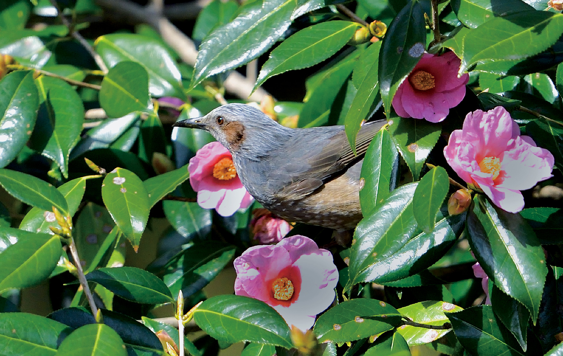 嘴(くちばし)の黄色は花粉。冬から春にかけて、ヒヨドリと花は持ちつ持たれつの関係を築いている。餌の少ない冬、ヒヨドリは花の蜜を吸い、花はヒヨドリに花粉を付けて他の花への受粉を促す。